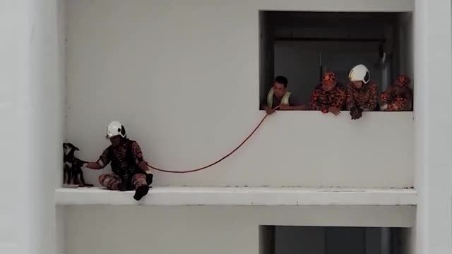 The mutt had somehow become stuck on the seventh-storey ledge of the apartment in the town of Teluk Kumbar on Penang Island on January 11. 2023-01-16 18:28:59