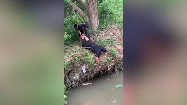 Footage shows a youngster reaching down the body of water while his friends pulled each of his legs to keep him from falling in Perak on November 26. 2023-01-10 18:03:24
