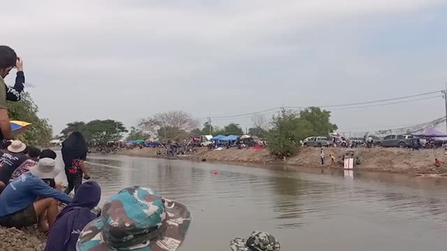 The motorboats were roaring across the river for the Wat Chedi Hoi Speedboat Contest in Pathum Thani province on January 8 when one of the participants went flying over the water. 2023-01-11 14:59:14