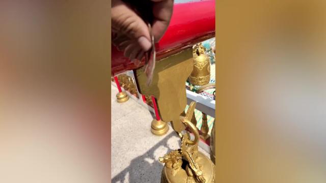 Footage shows the small brown bird stuck with its wings spread out on the sticky red paint outside a Buddhist shrine in Chonburi province. 2023-01-07 11:29:22