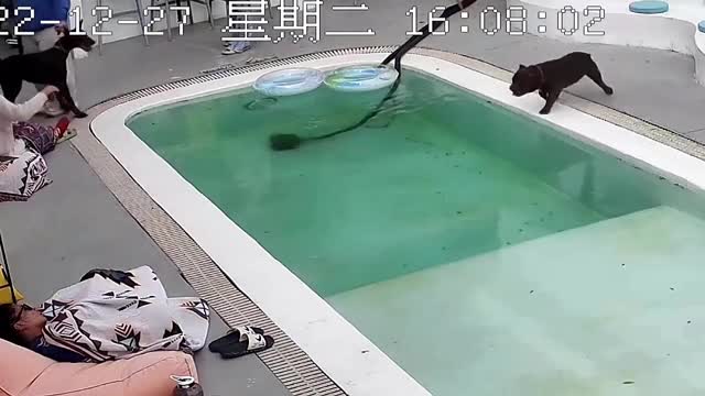 A chubby pitbull jumped into the water while playing but could not make its heavy body float in their home in Kaohsiung on December 22. 2023-01-03 17:41:31