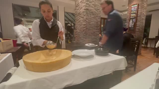The enormous parmesan cheese wheel was first doused in alcohol and set alight to melt the surface before the cooked pasta mixed with sauce and vegetables was poured in. 2022-12-30 16:19:39