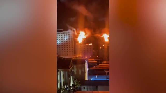 Footage shows the raging inferno in the early hours of Thursday morning at the Grand Diamond City Hotel and Casino in Poipet province on the border with Thailand. 2022-12-30 11:45:30
