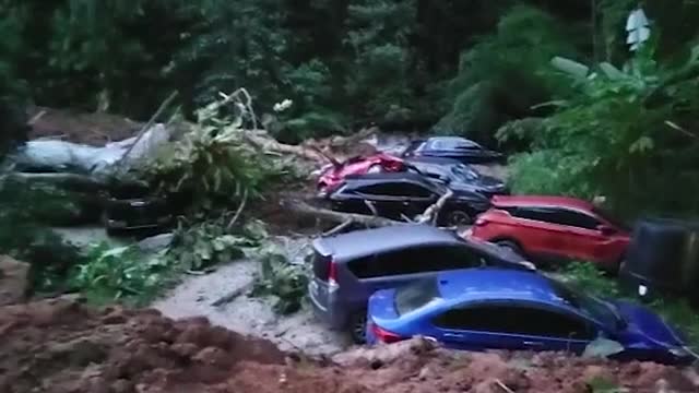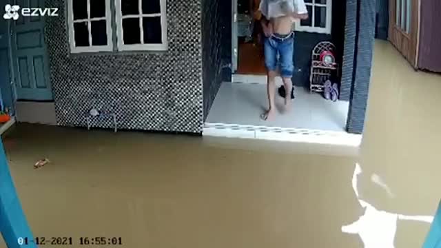 CCTV footage shows the man in a yellow shirt rolling up his pants as he prepared to wade through the deluge after heavy rain in South Kalimantan province on December 9. 2022-12-15 17:53:17