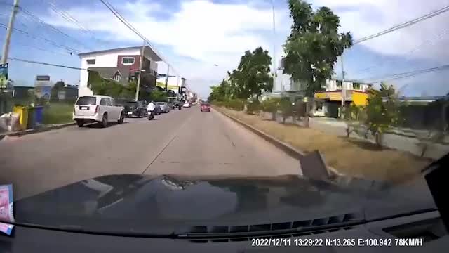 Dashcam footage shows the loose tyre from a passing 10-wheeler flying in from the opposite lane into Kanchanath Muttisant's black BMW while she and her husband were driving along Chonburi province on December 11.
