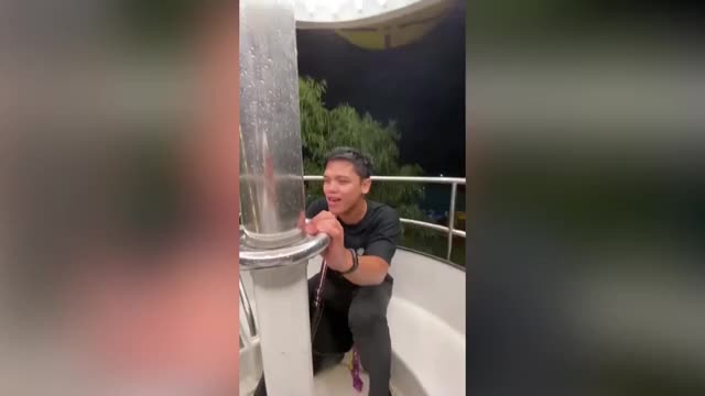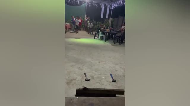 Footage shows the men running in a straight line to reach the tools and hit it in Negros Oriental province, the Philippines on December 4. 2022-12-12 18:31:43