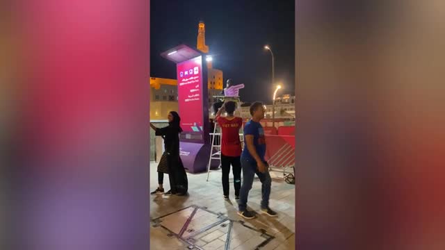 Footage shows the African volunteer with his large purple foam finger pointer while sitting on a raised chair with a megaphone while saying 'metro' on November 23 in Doha. 2022-11-24 10:26:10