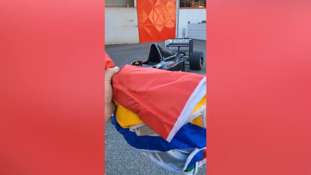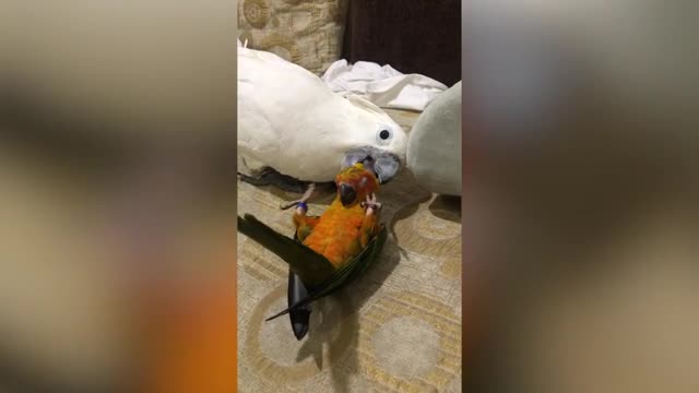 Terrified pet poodle barks at moving carton dog