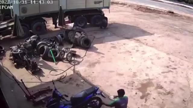CCTV footage shows apprentice mechanic Supachai Chutiyaranon, 19, pumping the wheel full of air in Nakhon Ratchasima province on October 31. 2022-11-04 17:08:45