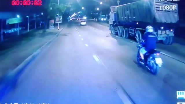 Dashcam footage shows the man on a two-wheeler almost crashing when a sedan nudged his vehicle in Samut Prakan province on October 16. 2022-11-01 17:17:22