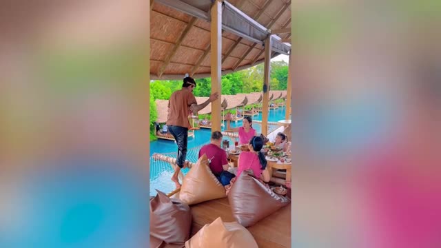 The hardworking member of staff took a basket of seafood to a family at the leisure park in Nakhon Pathom province, Thailand on October 27. 2022-11-01 17:17:16