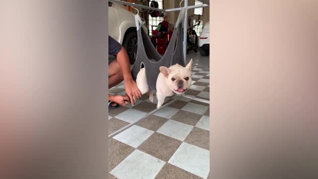 Footage shows the white pooch suspended from the gray cloth accessory while Kedsaraporn Hasun cut the creature's toenails in Chonburi province, Thailand on October 27. 2022-11-01 17:09:48