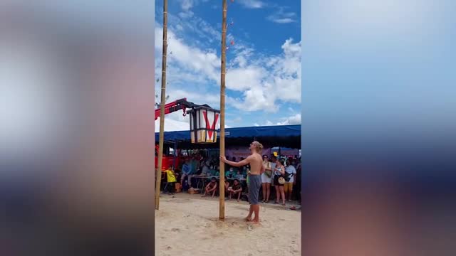 Footage shows the holiday maker gamely scaling the oil-slicked piece of wood to reach pieces of money in the amusing game at the buffalo racing event in Chonburi province on October 12. 2022-10-29 10:38:01