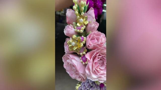 Store owner Aey Nitch creates the lovely arrangements by hand, painstakingly piecing together the blooms to complete colourful wreaths which she sells in Bangkok.