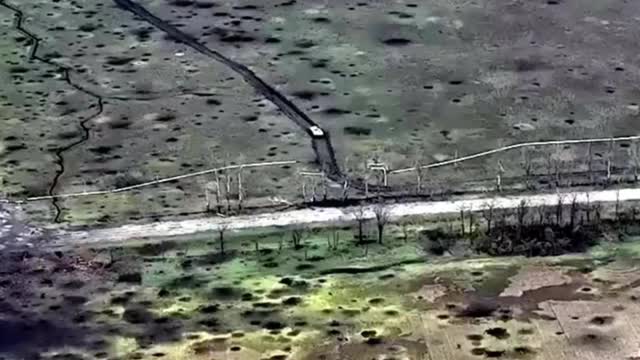 The footage shows the Russian armoured vehicle approaching a road along a dirt track before it suddenly explodes as it is hit by Ukrainian ordnance. The images then show the Russian BMP on fire.