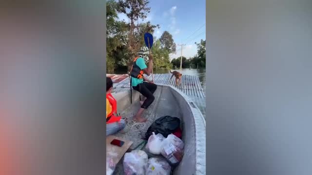 Villager Asoke and his friends rode on a boat to feed the starving animals in the inundated neighbourhood following heavy rain in Sisaket province on October 16. 2022-10-22 09:55:21