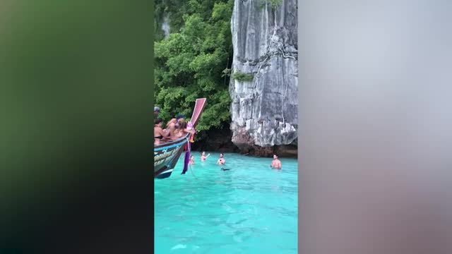 The primate troupe was spotted clinging to rock formations and trees on the shore when the vessel passed by Phi Phi island in Krabi province on September 1. 2022-10-24 16:03:20