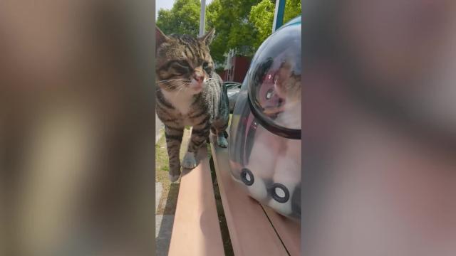 The striped moggie yowled persistently to grab the attention of its fellow feline inside the transparent travel bag as the woman took a stroll around a neighbourhood in Shanghai on May 24. 2022-10-20 20:15:47