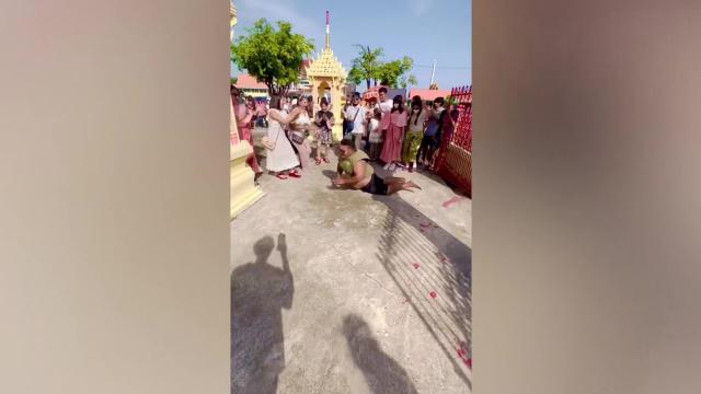 Footage shows the bulky temple-goer hyping up the crowd as he did headstands and bopped to loud music in Chanchoengsao province, on May 28. 2022-10-20 20:13:04