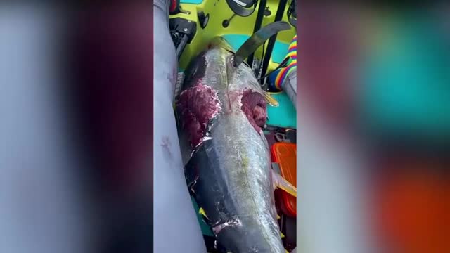 The first piece of footage shows the moment that the man, named Connor, hauls the first large tuna fish out of the water with his fishing rod. He can be heard saying: 'He's been sharked I think. No way he would be coming up this easy after that.' 2022-10-17 16:07:43