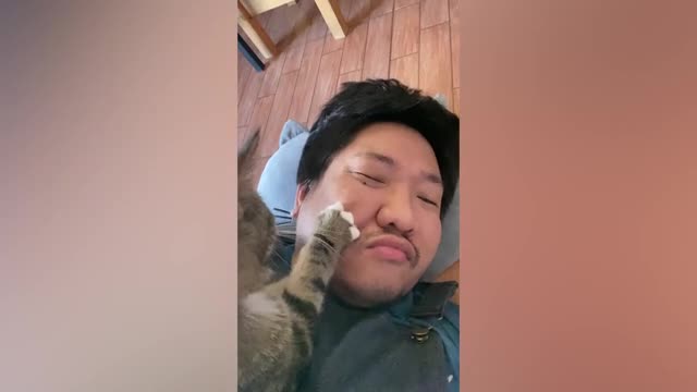 Footage shows the feline's large paws dabbing on his master's cheek while they relaxed in the staff room of a pet cafe in Udon Thani province, Thailand on September 8. 2022-10-13 17:38:14