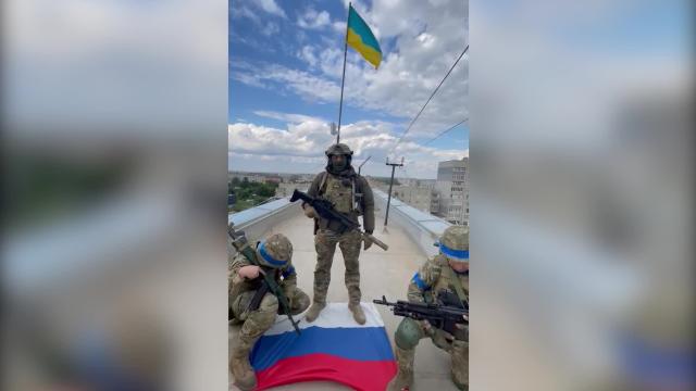 In the video, the Ukrainian soldier in the middle says (in Ukrainian): 'Mr President, Mr Commander-in-Chief, the city of Balaklia of the Kharkiv region has been taken under control, the order has been carried out. Kraken Special Branch of the Main Directorate of Intelligence September 8, 4:00 p.m. Glory to Ukraine!' 2022-09-12 17:41:59