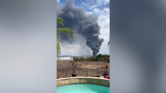 Video shows a column of thick black smoke billowing from the 500,000-square-foot commercial building in Riverside County on September 12. 2022-09-13 10:29:49