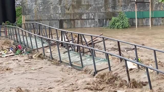 The metal structure was pulled from its attachments as a swollen river pounded it in the town of Mandaue in Cebu province, the Philippines, on September 9. 2022-09-10 17:43:05