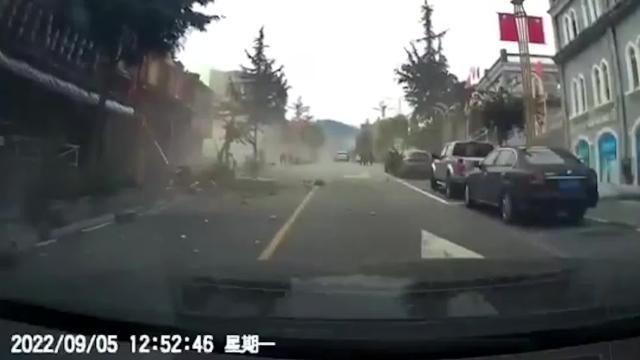 Dashcam video shows how trees, street lamps, and cars along the street suddenly start violently shaking while motorists drove through Luding County in Sichuan province on September 5. The tremors caused part of a building to crumble, sending locals panicking on the road.