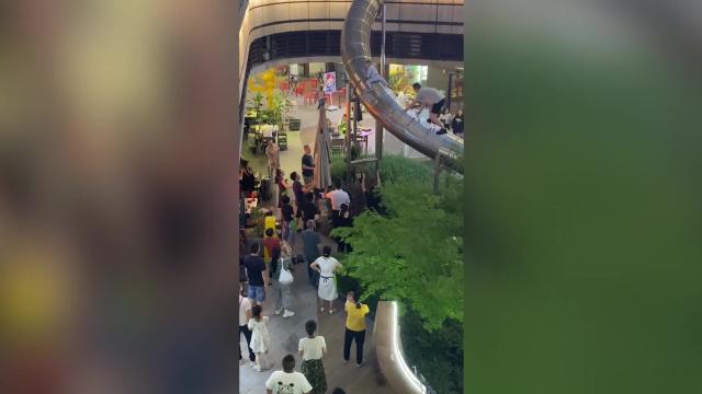 Video shows the man climbing along the outside of the structure towards the youngster, who clung for dear life on the attraction several feet off the ground in Chengdu City, Sichuan province on June 18. 2022-09-03 11:35:10