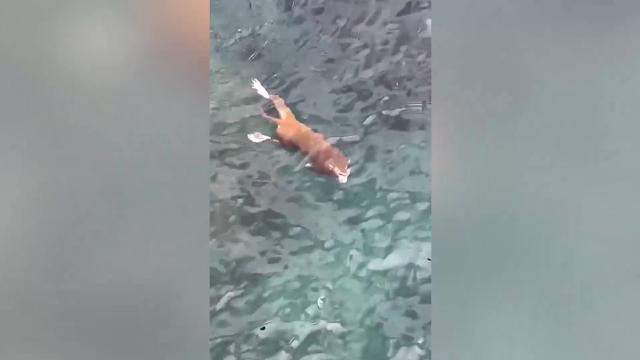 The creature, which appeared to be a macaque, was spotted taking a dip during a sunny day in the clear waters of Sanya City in tourist hotspot Hainan province on August 30. 2022-09-03 10:37:58