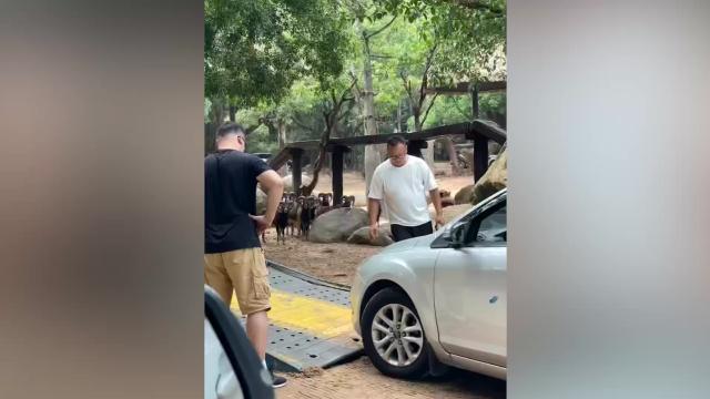 The horned animals stood off to the side as a pair of tourists inspected the malfunctioning vehicle in the Changlong Safari Park in Guangdong province on July 31. 2022-09-03 11:28:37