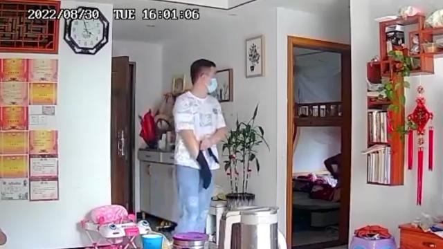 The alleged burglar is seen sneaking in through the unlocked door of the house in Zhaoqing City, Guangdong province at noon on August 30, apparently thinking it was unoccupied. 2022-09-03 10:50:11
