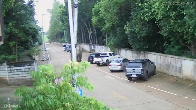 CCTV footage shows the locals fleeing behind the building's walls and hiding inside their cars when the jumbo named Jao Aon charged at them in Nakhon Ratchasima province on August 25. 2022-09-02 17:48:43