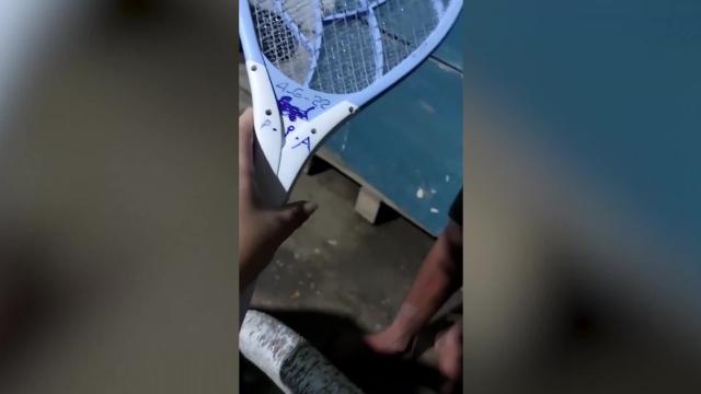 Footage shows staff making a sweep of the dog's sleeping area in Yangon on August 22, with the rackets emitting a loud zapping sound upon hitting the blood-sucking bugs. 2022-08-24 19:39:10