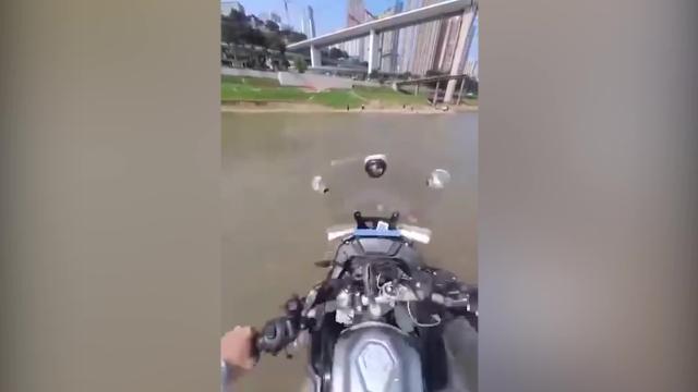 Footage shows the motorcyclists, reportedly Chongqing residents, riding through the shallow waters of the Yangtze River tributary on August 16. 2022-08-19 13:30:07