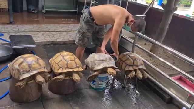 Footage shows the large aquatic reptiles named Sugus, Tong, Khem and Suay resting on buckets and stools while owner Noppadol Thongpan gave them a bath in Bangkok, Thailand. 2022-08-19 18:03:20