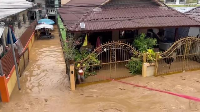 Video shows residents sending a bucket full of food to their neighbours, who were stuck at home due to the deluge in Chiang Rai's Mae Sai district on August 13. 2022-08-16 18:13:25