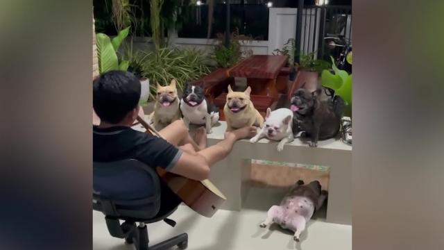 Footage shows the man strumming on the strings while the pooches appeared mesmerised with the music in Bangkok, Thailand on May 31. 2022-08-12 17:40:16