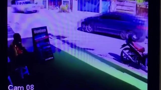 CCTV footage shows the motorcycle taxi man sitting in front of a convenience store before a white vehicle came crashing on the shop's waiting area in Ayutthaya city on August 10 afternoon. 2022-08-15 15:22:27