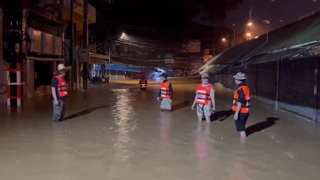 Footage shows the situation in Chiang Rai province on Friday evening with rescue teams wading through the muddy deluge to hand fresh food and water to stricken locals. 2022-08-13 10:37:07