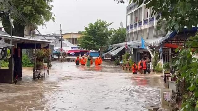 Footage shows the situation in Chiang Rai province on Saturday morning with rescue teams wading through the muddy deluge to hand fresh food and water to stricken locals. 2022-08-13 10:46:18