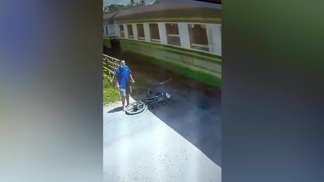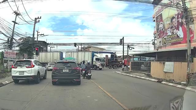 Security footage shows the biker waiting next to a white car while the barrier was lowered at the Na San station crossing in Surat Thani province on August 13. 2022-08-15 15:09:47