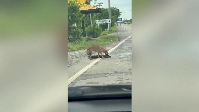 The brave brown dog named Hand was playing with Soh, a three-month-old white mutt, in their owner's yard in Lopburi province, Thailand, on August 5. 2022-08-08 17:11:55