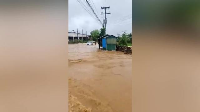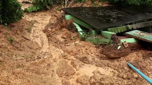 Footage shows the structure collapsing with the eroded soil on a muddy hill hours after a tropical storm in Trat province on August 7. 2022-08-08 18:02:57