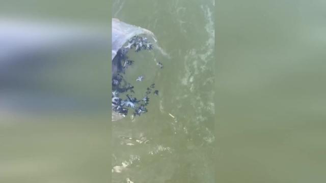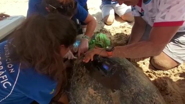 Footage of the record birth on Les Ortigues beach in the town of Guardamar del Segura, in the south-eastern Spanish province of Alicante, in southern Valencia, shows turtle specialists and volunteers helping the mum give birth in the shallow nest she had dug, after having fitted the large animal with a GPS transmitter.