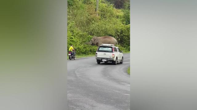 Footage shows the jumbo taking over the main road and holding up traffic passing through the sprawling woodland of the Khao Yai National Park in Nakhon Ratchasima province on April 20. 2022-08-01 17:06:12