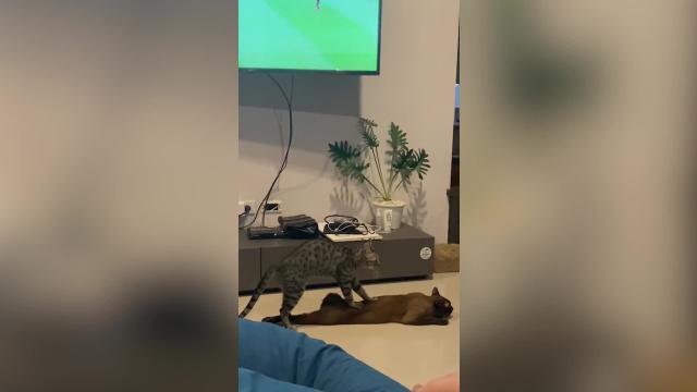 The four-year-old female moggy named Tua Piak was giving the older female cat, six-year-old Tua Lek, a healthy rub down at the family's home in Nonthaburi province, Thailand on June 12. 2022-08-01 18:01:38
