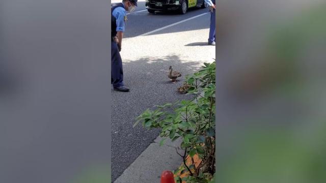 The caring officers spotted the mother and her ducklings trying to get from one side of the highway to the other in Tokyo on June 4. 2022-08-01 17:35:09
