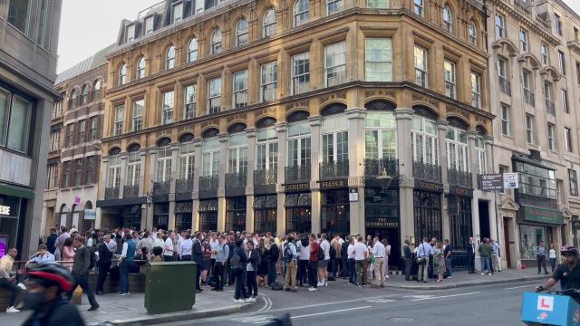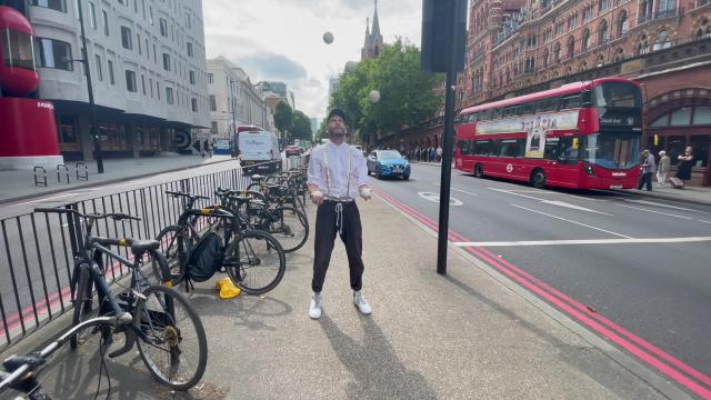 The street entertainer was seen dashing out into the road each time vehicles stopped at the crossing in front of the St Pancras train station on Euston Road in London. 2022-08-01 17:03:20